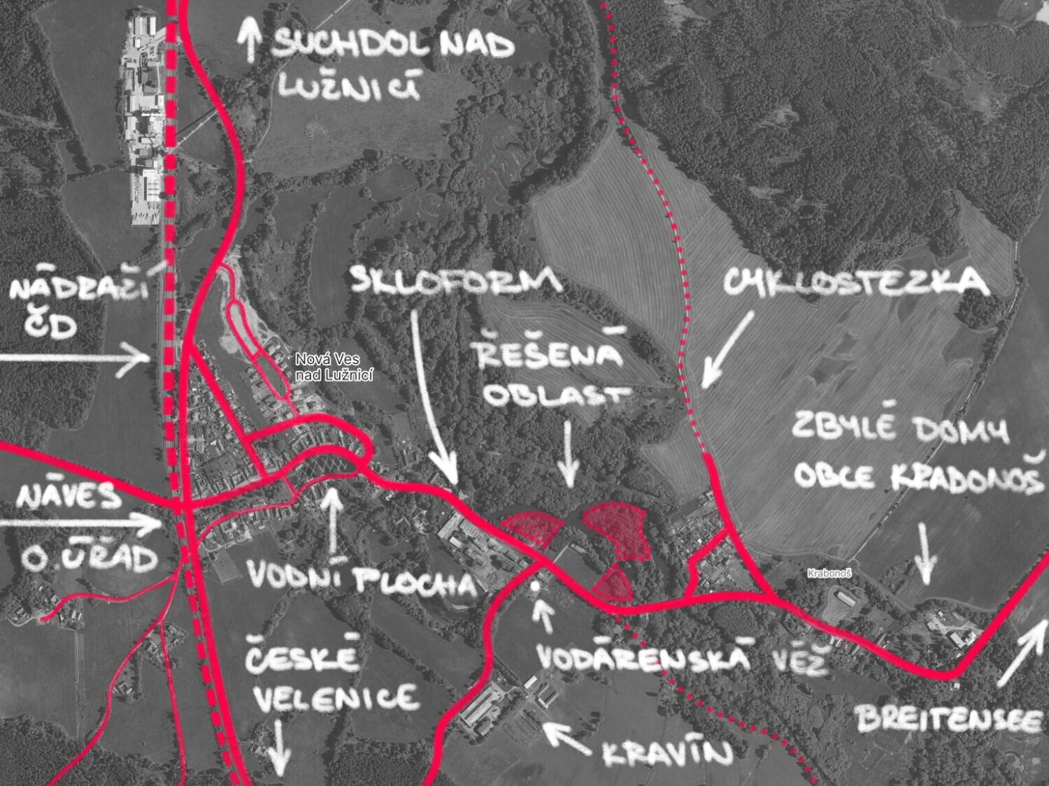 Parkování na blátě, pálené větve, houští, mokro a trocha trávy ze sekaček. Tak by se dalo popsat cca 19 000m2 přilehlých pozemků u fotbalového hřiště mezi obcemi Nová Ves nad Lužnicí a Krabonoš. Stávající fotbalové hřiště navrhujeme doplnit a tím rozšířit stávající místo setkávání obyvatel o další možnosti volnočasových aktivit, jako je nerušené posezení v přírodě s kulisou šumění řeky, rybaření, místo k pikniku nebo otestování svých dovedností na některém z hřišť či terénních stezek pro kola. Bude možné se projít pod stíny stromů a sledovat, jak se příroda mění, pohrát si na dětském hřišti a v neposlední řadě využít novou uměle vytvořenou terénní krajinu pro rozličné hry letní nebo i zimní.