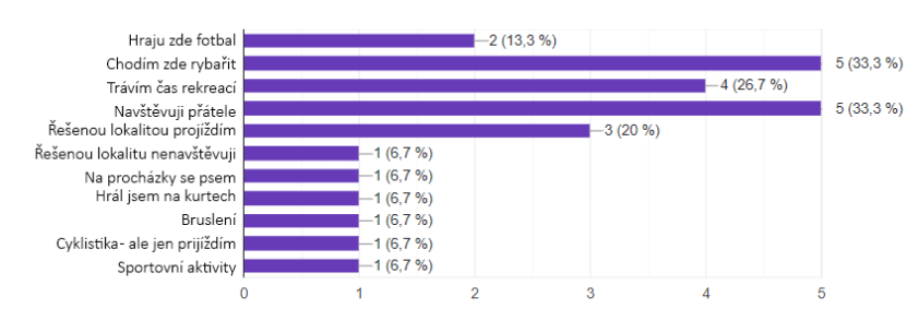 Z věkového složení respondentů je zřejmé, že daná oblast nejvíce zajímá obyvatele v produktivním až důchodovém věku. Respondenti lokalitu využívají k volnočasovým a sportovním aktivitám. Důležité je také zmínit, že někteří respondenti nemají v současné chvíli k lokalitě fotbalového hřiště vztah a nemají důvod ji navštěvovat.