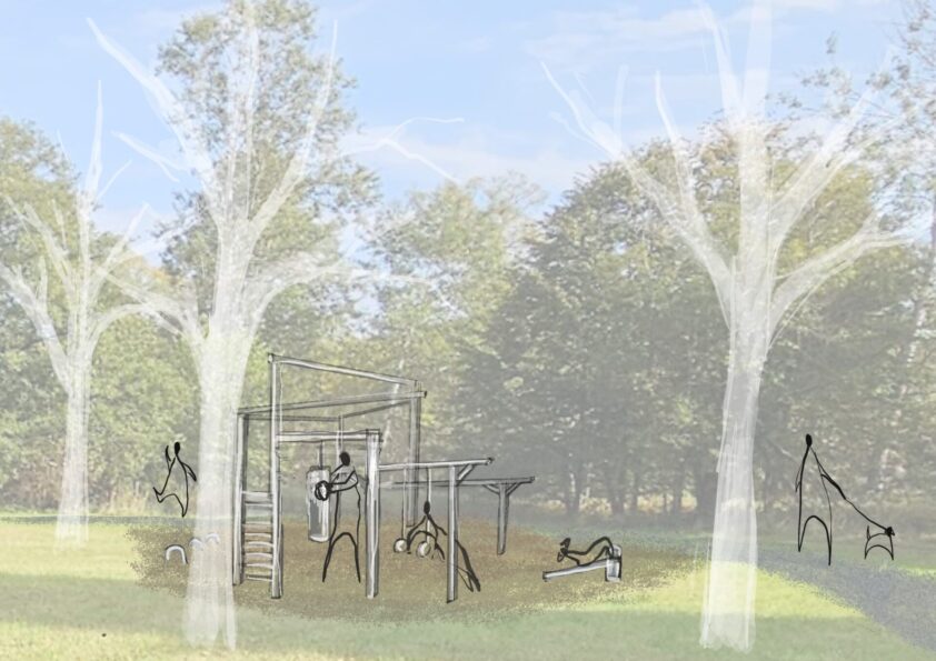 Napravo od fotbalového hřiště navrhujeme workoutovou zónu, která nabídne prostor pro cvičení a sport pro všechny obyvatele. Zároveń bude navržena tak, aby ji mohli využívat i fotbalisté pro své tréninky, čímž získají další možnosti pro rozvoj své kondice a síly.