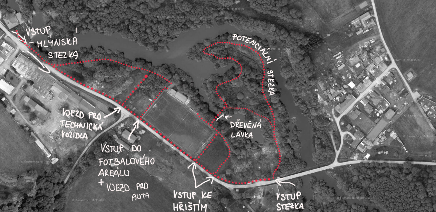 Prostor kolem hřiště zpřístupňujeme pouze pro pěší a cyklisty, čímž vytváříme klidné a bezpečné prostředí pro procházky a relaxaci. V návrhu pracujeme s myšlenkou odklonit člověka co nejdříve ze silnice a nabídnout mu procházku podél řeky s místy pro zastavení s výhledem a místy pro odpočinek.